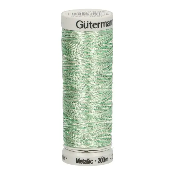 Guldtråd. Broderitråd metallic i grönt och silver. Färg 7052 Passar utmärkt för effektfulla broderier på de flesta material. Av polyester, 200m per rulle.