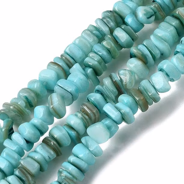 Platta snäckskalspärlor i turkost med oregelbundna storlekar. Storlekarna varierar mellan 4,5-9mm