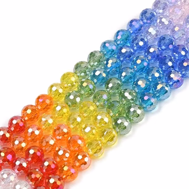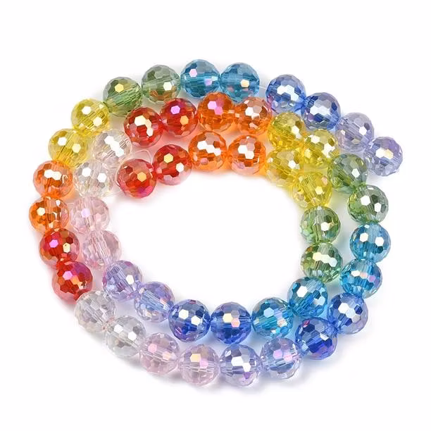 Runda facetterade och elektropläterade glaspärlor i regnbågens färger. Pärlan är 8mm och har ett hål på 1,2mm, ca 48 pärlor per sträng.