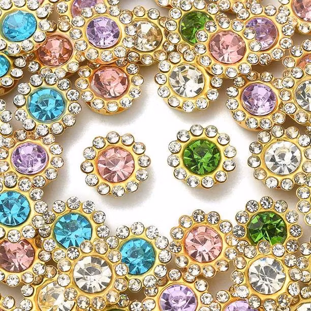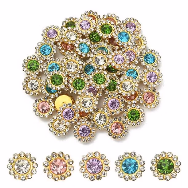 Vackra strassdekorer av metall och glas. Dessa strasspärlor sys fast och passar till alla tänkbara textila konstverk som tex armband, tavlor, smycken, kläder mm.