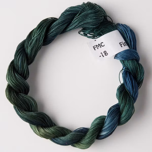 En handfärgad tråd av tunn merceriserad bomull som består av tre hårt tvinnade trådar, ej delbar. Färgerna är starka och med fin lyster, passar till alla fr