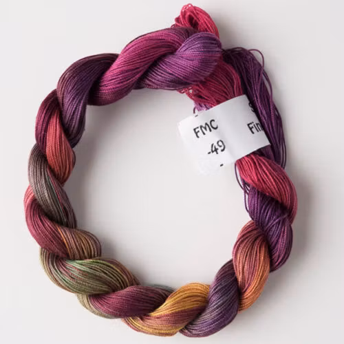 En handfärgad tråd av tunn merceriserad bomull som består av tre hårt tvinnade trådar, ej delbar. Färgerna är starka och med fin lyster, passar till alla fr