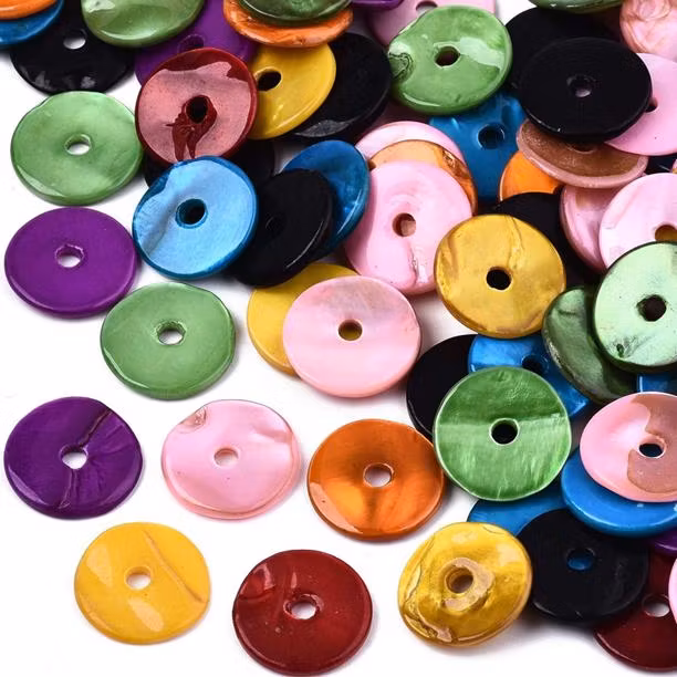 Runda platta pärlor av snäckskal med ett hål i mitten.
