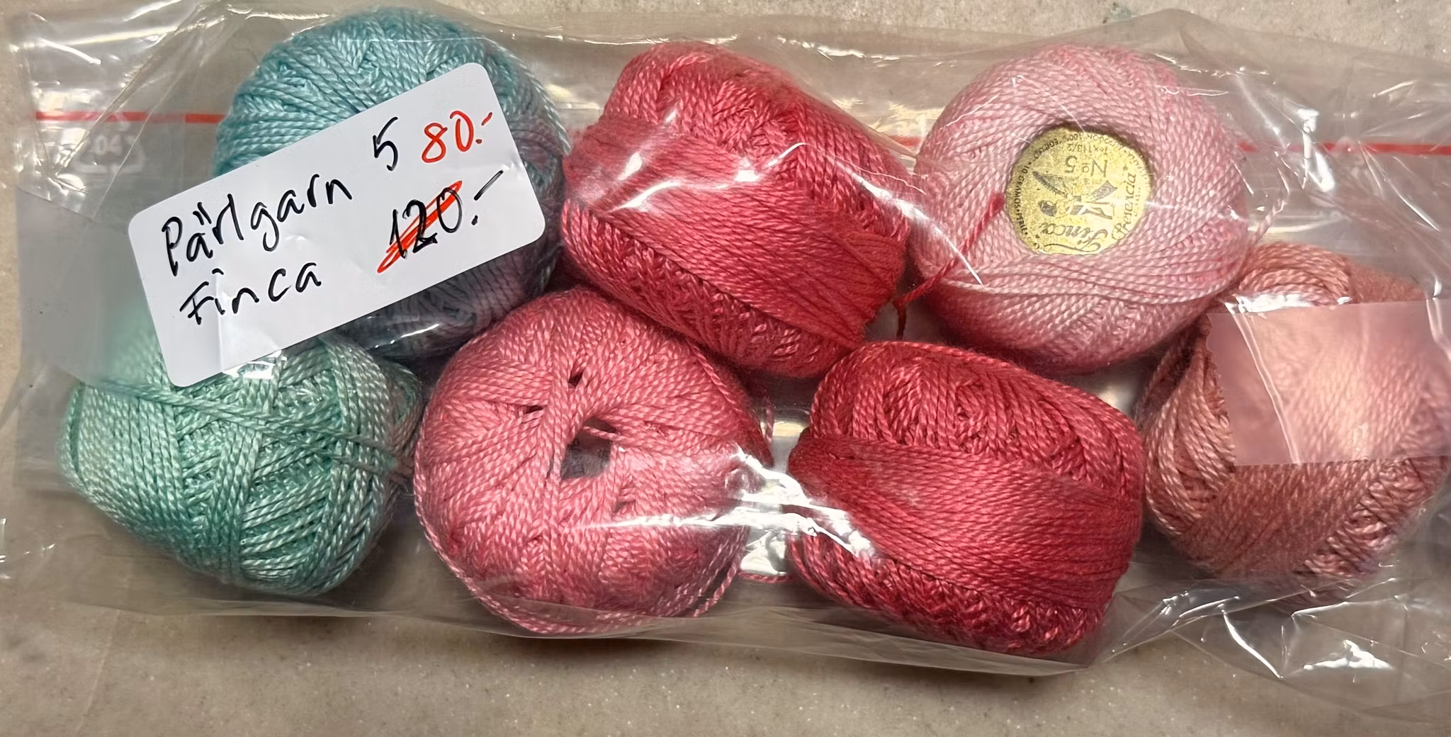 Pärlgarn 5 av märket Finca, 7 nästan fulla rullar. Pastellfärger enligt bild